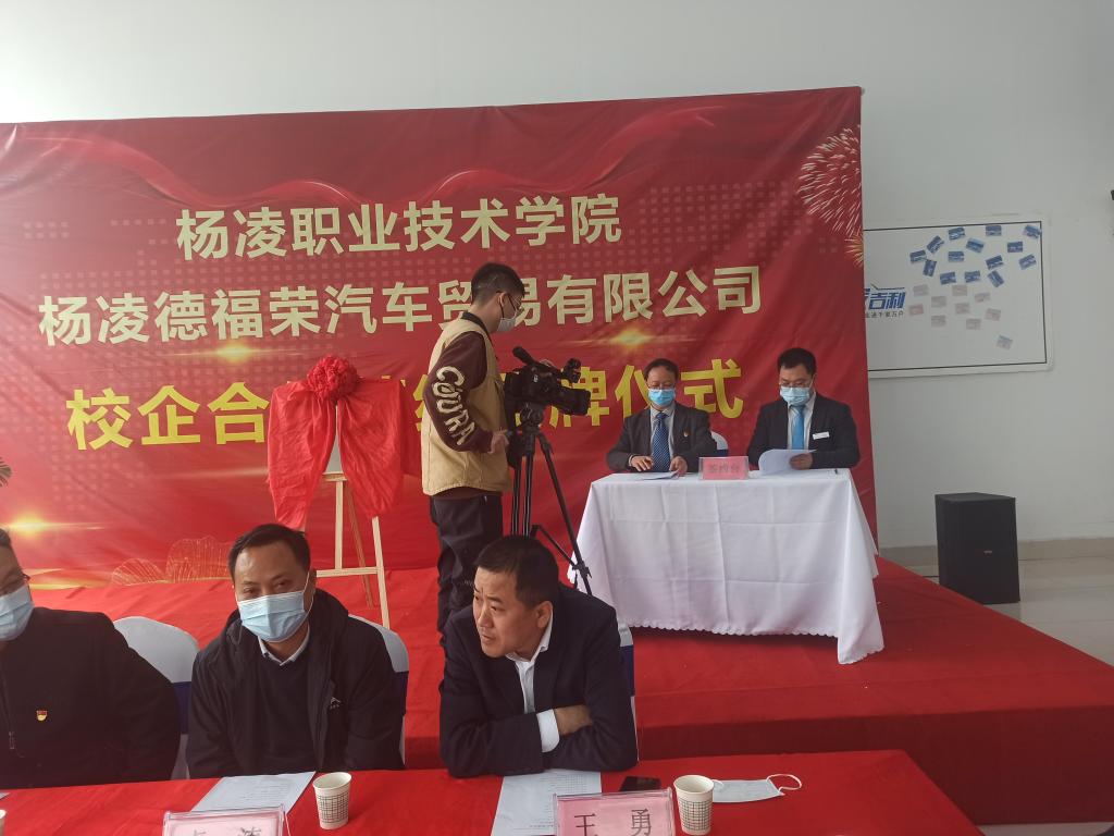 3月30日上午,我校机电工程学院与杨凌德福荣汽车贸易有限公司举行校企合作签约暨校外实训基地揭牌仪式。杨凌示范区工商联党组书记卓涛,杨陵区委常委、组织部部长王勇,杨陵区工商联党组书记李俊苗、工信局局长陈团江及李台街道党工委相关领导,我校机电工程学院党总支书记马秀魁、院长龙建明,杨凌德福荣汽车贸易有限公司法人穆斌、总经理穆涛等出席签约仪式。