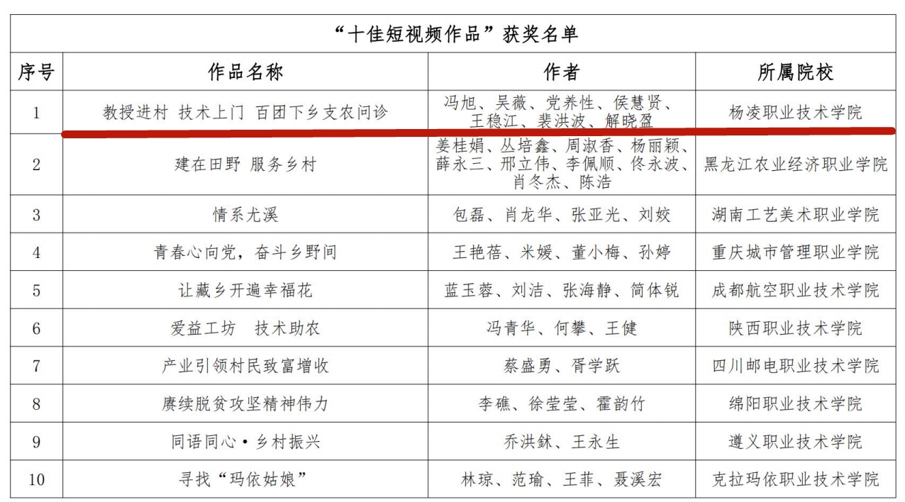 11月13日,全国职业院校巩固扶贫成果服务乡村振兴协作联盟公布了“乡村振兴 职教同行”摄影暨短视频大赛作品评选结果,冯旭团队创作的短视频《教授进村技术上门百团下乡支农问诊》获得“十佳短视频作品”,我校获优秀组织奖。获奖作品将通过联盟公众号和网站宣传推介并向全国主流媒体和上级部门重点宣传推介。