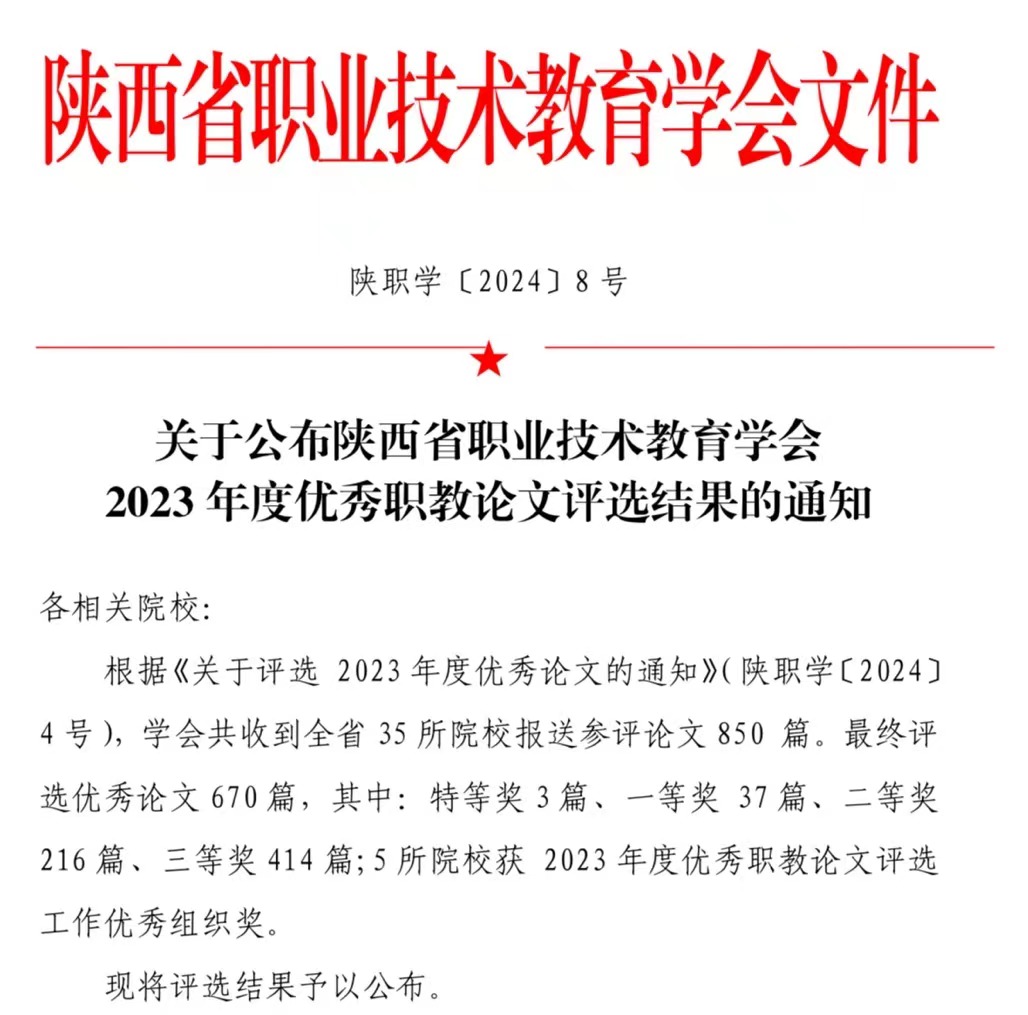 近日,陕西省职业技术教育学会公布了2023年度优秀职教论文评选结果。我校54篇论文获陕西省职业技术教育学会优秀论文奖,其中一等奖1篇、二等奖19篇、三等奖34篇,学校荣获2023年度优秀职教论文评选工作优秀组织奖。