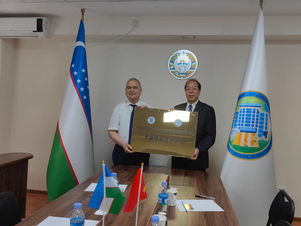 在乌兹别克斯坦古利斯坦国立大学,仲伟周实地参观了该校农业园和生物工程、物理、艺术等学院的教学设施与条件,并与该校就双方开展国际合作的内容和方式进行了深入交流。双方在专业技术技能培训、师生交流、基地建设等方面达成合作意向,签订了《专业技术技能培训项目合作协议书》,仲伟周向古利斯坦国立大学授予“杨凌职业技术学院-古利斯坦国立大学专业技能培训基地”牌子。