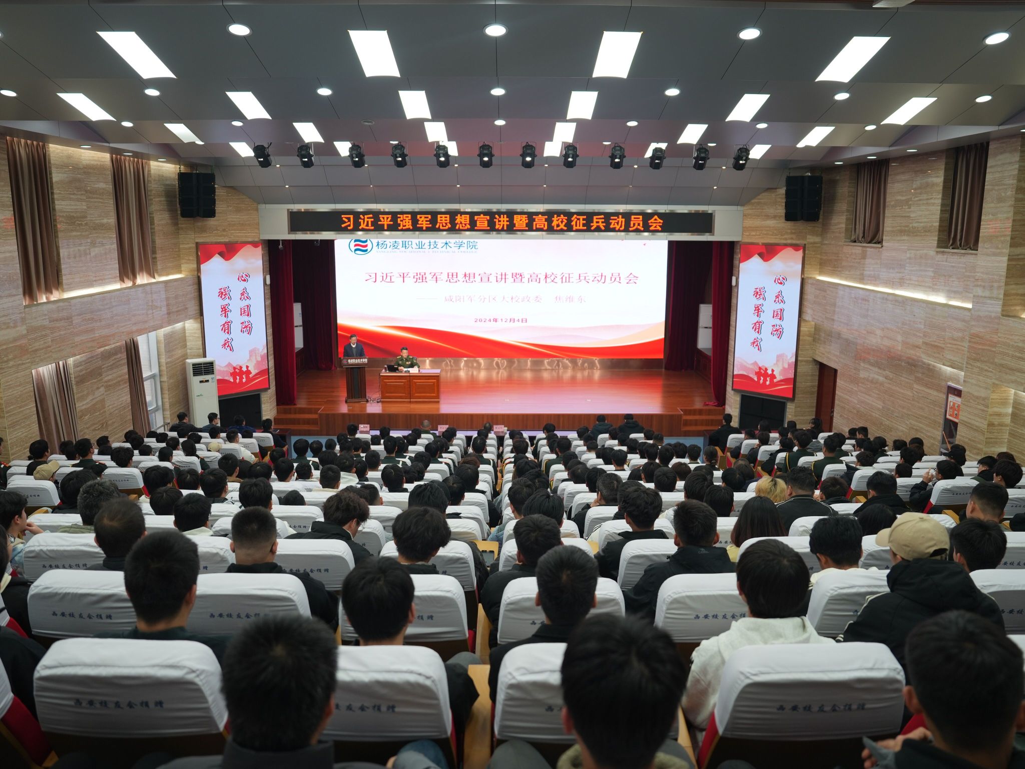 12月4日下午,学校召开习近平强军思想宣讲暨高校征兵动员会。副校长张朝晖主持会议,邀请咸阳军分区大校政委焦维东作专题报告。咸阳军分区动员处欧元军、区人民武装部李正文,校学工部负责人、退役复学学生志愿服务队、国旗护卫队及师生代表共280余人参加会议。
