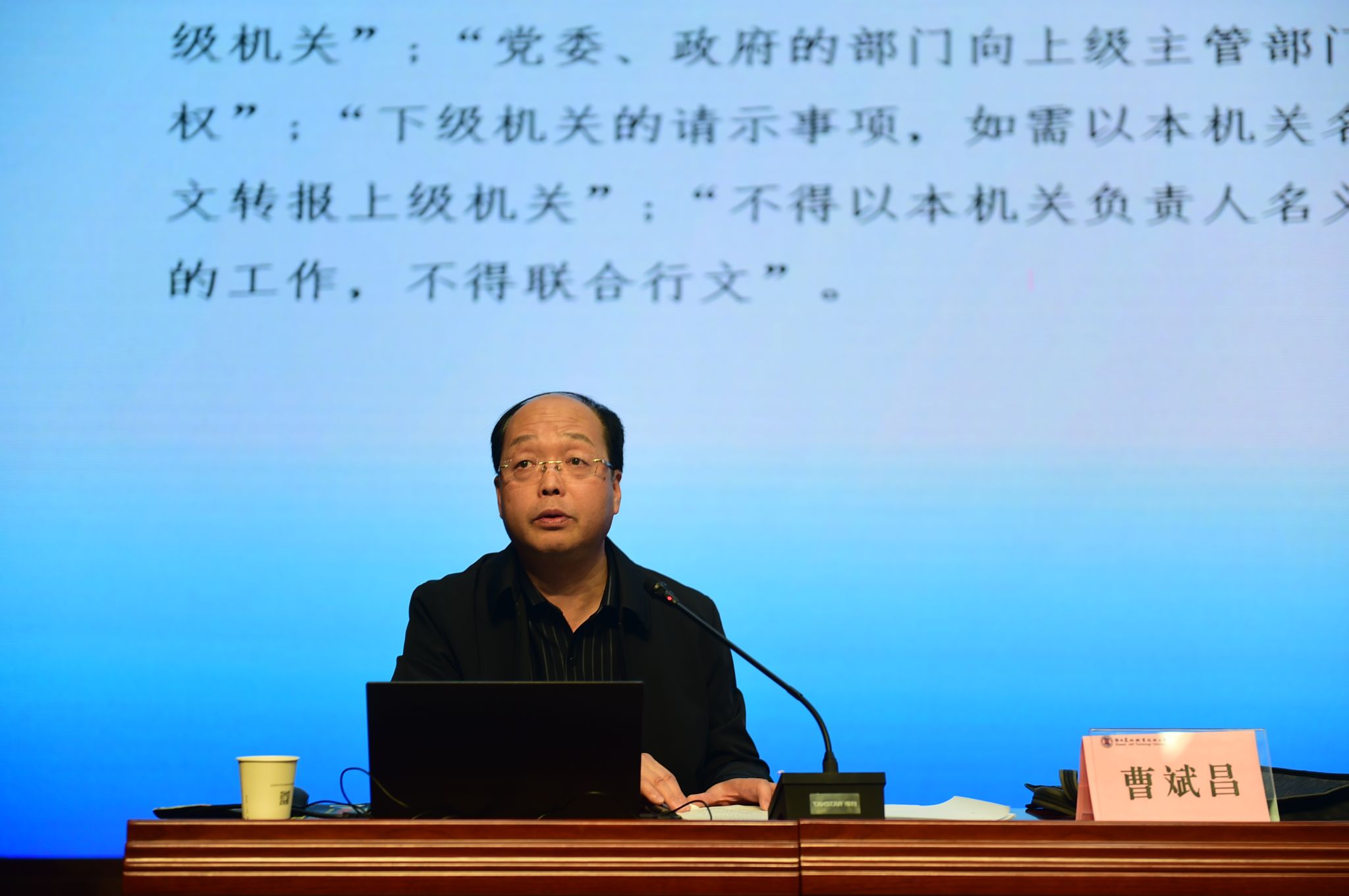 曹斌昌作题为《文秘工作与政务服务》的专题培训。他结合办公室工作30余年的工作实践与体会,围绕《党政机关公文处理工作条例》解读、综合文字基本功训练、调查研究能力提升以及政务服务工作优化等四个方面,作了一场立意高远、体系完整、案例详实、讲解生动的精彩辅导报告。