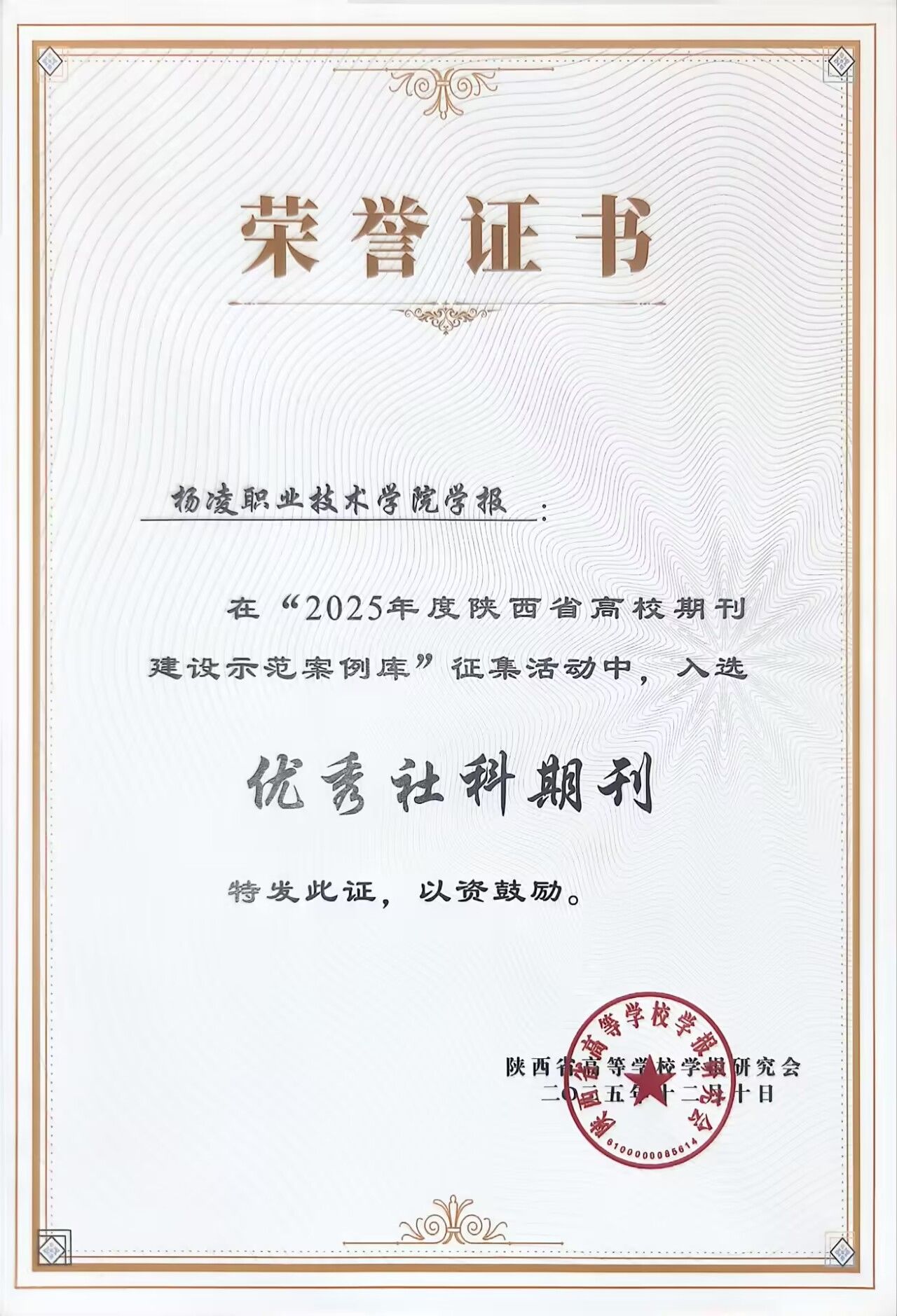 12月11日至12日,陕西省高等学校学报研究会九届六次理事会议暨2025年秋季学术年会在杨凌召开。我校学报荣获“2025年度陕西省高校期刊建设示范案例库·优秀社科期刊”,学报编辑部吴薇副研究员撰写的论文《基于角色理论与组织支持双视角的高职学报编辑压力调适策略探究》入选该案例库“铜笔论著”类成果。