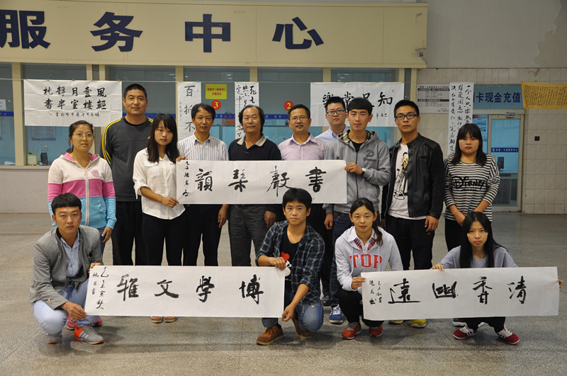 此外,我院书画艺术中心李德君老师也应邀前来参观指导,同学们热情洋溢地围在李老师身边请教学习。李老师即兴挥毫泼墨,书写了“书声琴韵”、“清香幽远”、“博学文雅”等作品,摇曳生香,充满神韵。