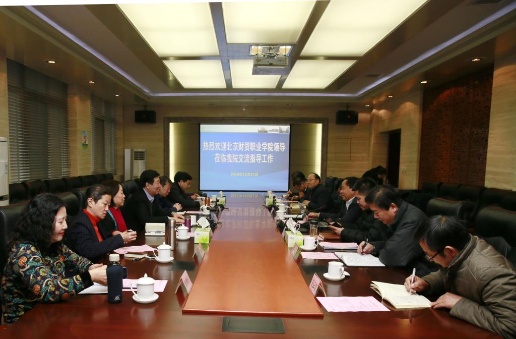 上午,北京财贸职业学院院长王成荣一行7人来我院参观访问。上午9:00,座谈会在醒钟楼A208会议室举行。院长王周锁、党政办公室、人事教师处、教务处、招生就业处、纪检监察审计处、旅游与管理分院、思想政治理论课教学部等部门主要负责人出席座谈会。