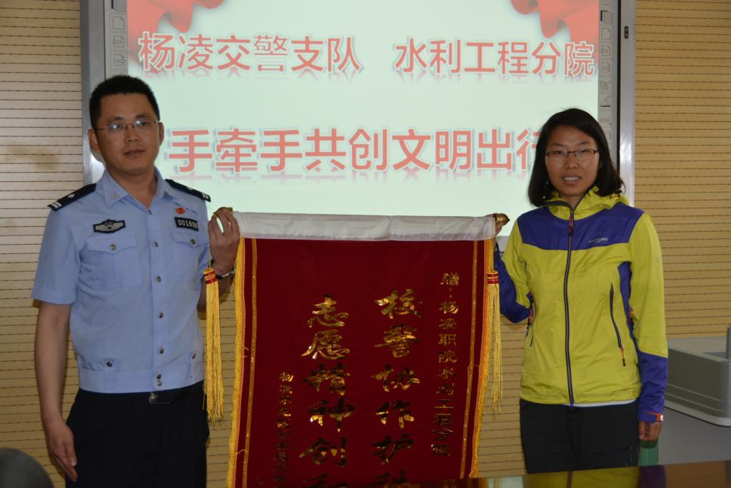 近日,杨凌示范区交警支队为我院水利工程分院送来一面锦旗。鲜红的锦旗上“校警协作护秩序 雷锋精神创和谐”十四个金色大字格外醒目,借此向水利工程分院与交警支队合作开展的“手拉手·安全出行”校警协作志愿者服务活动表示感谢!
