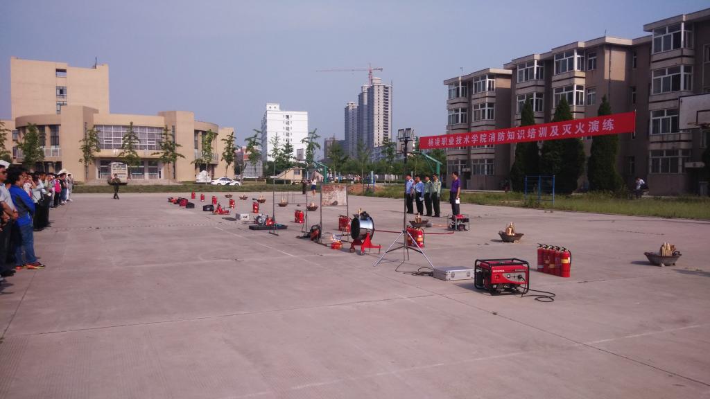 在第7个全国防灾减灾日来临之际,为普及消防安全知识,增强广大师生的消防安全意识,提高处置突发火灾的应急能力,5月11日下午,我院学保处在南校区原二中篮球场举办了消防安全知识培训和灭火演练活动,邀请杨凌示范区消防支队特勤中队的20余名指战员现场培训指导。学院各分院学生代表,全体辅导员、班主任,学院义务消防员,保安队队员,机关各处室教职工代表及教务处、后勤处、图书与信息中心、学生公寓等消防重点单位职工共计300余人参加了现场培训和演练。