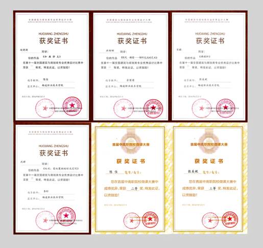 8月20日至21日,第十一届全国建筑与规划类专业优秀设计比赛在江苏常州城乡建设职业学院举行。经评审,我院生态环境工程分院的赵晓颖同学作品《和廉精美》获室内设计组一等奖;宋毅同学作品《旖旎轩》获室内设计组二等奖;洪甜甜同学作品《驻足·凝望———倾听交流的艺术》获环境艺术设计组二等奖;沈婷同学作品《幻术:变幻莫测的时光空间》获环境艺术设计组三等奖。此外,在同期举行的首届中高职院校微课大赛中,我院教师陈佳获二等奖,张美妮获三等奖。