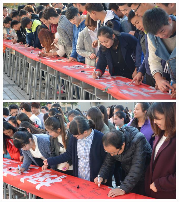 分院负责人作首先动员讲话,学生代表刘欣向全体学生发出了“遵纪守法,关注安全,节俭卫生,文明养成”的倡议。活动现场,分院师生积极参与,纷纷上前签名,一些路过的师生也都驻足前来参与,给予支持。
