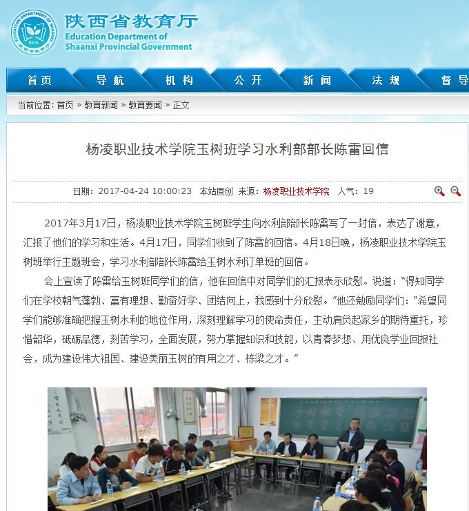 【陕西省教育厅】杨凌职业技术学院玉树班学习水利部部长陈雷回信
