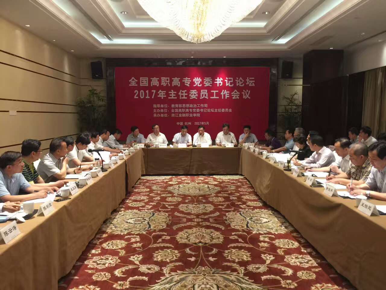 本次会议由教育部思想政治工作司指导全国高职高专党委书记论坛主任委员会主办浙江金融职业学院承办共有来自新疆农业职业技术学院、上海工程技术大学天津中德应用技术大学、四川交通职业技术学院等23家高职高专主任委员单位的40余名代表参加会议。教育部思想政治工作司司长张东刚浙江省教育工委副书记、教育厅副厅长鲍学军到会指导。