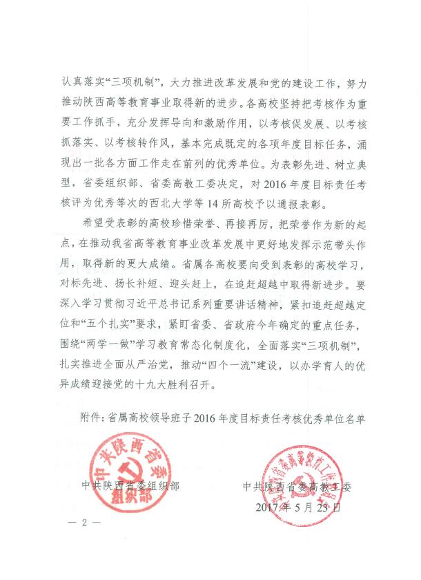5月23日,省委组织部、省委高教工委对2016年度目标责任考核优秀等次的14所高校予以通报表彰,我院获省属高等学校领导班子2016年度目标责任考核优秀单位。这是我院继2015年度后,再次荣获此荣誉。
