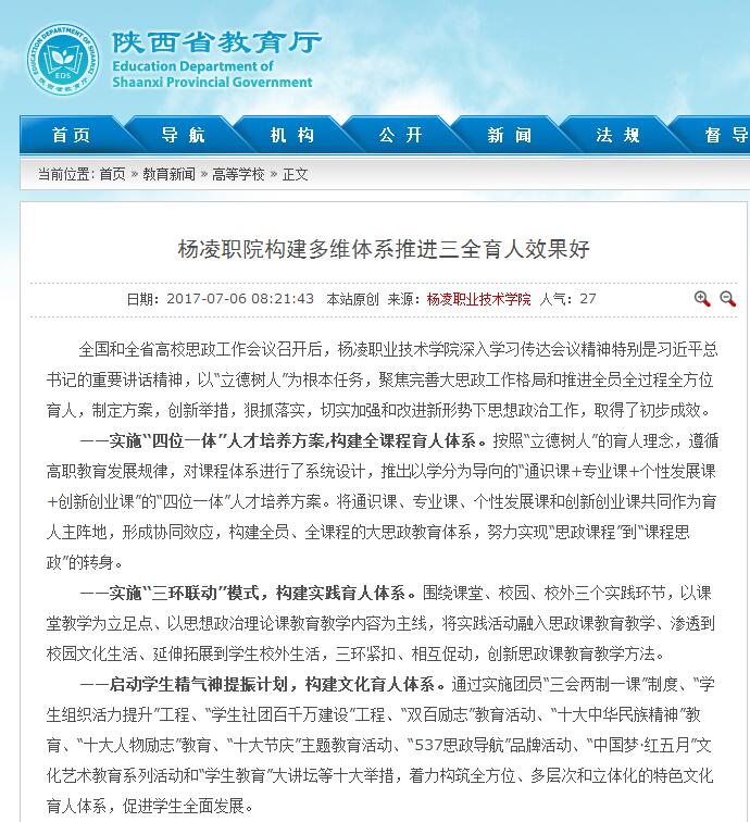 全国和全省高校思政工作会议召开后,杨凌职业技术学院深入学习传达会议精神特别是习近平总书记的重要讲话精神,以“立德树人”为根本任务,聚焦完善大思政工作格局和推进全员全过程全方位育人,制定方案,创新举措,狠抓落实,切实加强和改进新形势下思想政治工作,取得了初步成效。