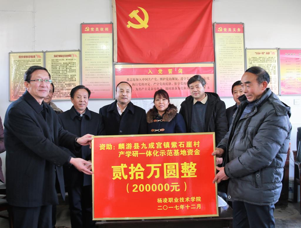 12月15日,为贯彻落实 《全省脱贫攻坚 2017冬季行动方案》精神,扎实推进高校结对帮扶“双百工程”,有效地为当地特色产业服务,我院党委书记赵曼、党委副书记任得元一行来到麟游县九成宫镇紫石崖村,为该村捐赠20万元,用于建立中蜂养殖产学研一体化示范基地、核桃丰产栽培产学研一体化示范基地及电商网络平台。