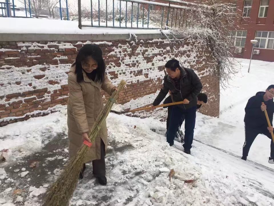 虽然天气寒冷、积雪深厚,但这一点也没有影响大家的参与热情和工作效率,大家有的拿铁锹,有的拿扫帚,有的拿簸箕,团结协作,齐心协力地开展了除雪活动。尽管每个人的脸都冻得通红,但手中的扫雪工具却不停地忙碌着,经过2个小时的劳动,大家将积雪和冰层一点点地铲起集中堆放,在寒风中清理出了干净畅通的道路,最后还堆起了一个雪人。劳动的过程中充满了欢声笑语,整个扫雪队伍也成了冬日校园里一道靓丽的风景线。