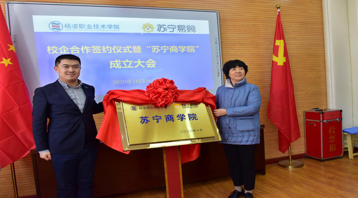 10月16日下午,我校与苏宁易购集团校企合作签约仪式暨“苏宁商学院”成立大会在经济与贸易分院举行。学校党委副书记、纪委书记刘粉莲,学校党委委员、教务处处长拜存有,经济与贸易分院党总支书记李嘉鸣、副院长杨宏祥,陕西苏宁易购销售有限公司总经理程峰,苏宁易购西安大区物流公司总经理雷宏波、电器店运营中心总监肖强、人力资源中心总监杨花,及分院全体教师共40余人参加成立大会。大会由产教融合处副处长郑爱泉主持。