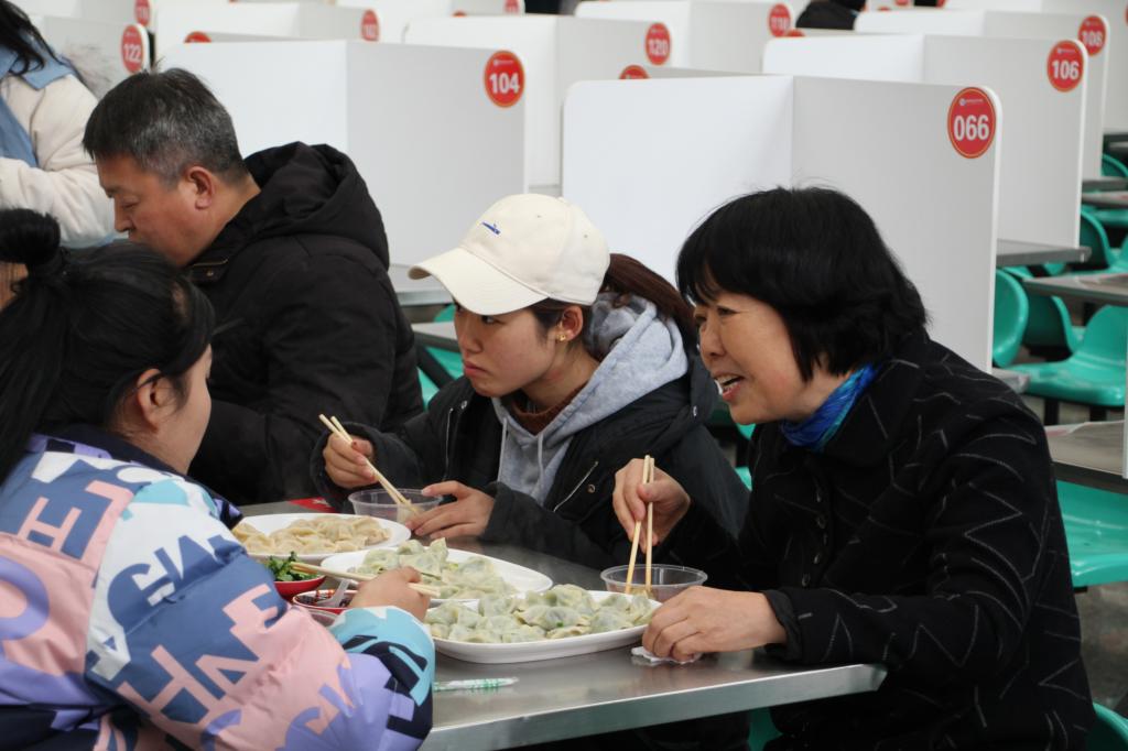 “你们是哪个专业的学生?”“大学的学习生活适应了吗?”“在家里的时候包过饺子吗?经常劳动吗?”……从学习到生活,领导们与学生们亲切交谈。大家一边品尝自己亲手包的饺子,一边拉家常、聊学习、谈生活、话冬至,欢声笑语随着饺子的香味弥漫在整个餐厅里。