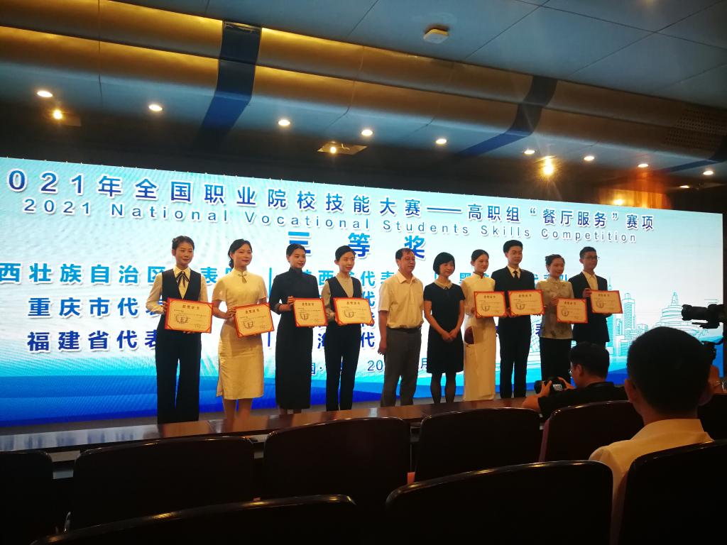6月19日至23日,2021年全国职业院校技能大赛(高职组)“餐厅服务”赛项在青岛酒店管理职业技术学院举行,来自全国各地的32支代表队64名选手参赛。由我校旅游与管理学院学生汤佳佳、张莹组成的陕西省代表队获该赛项三等奖。