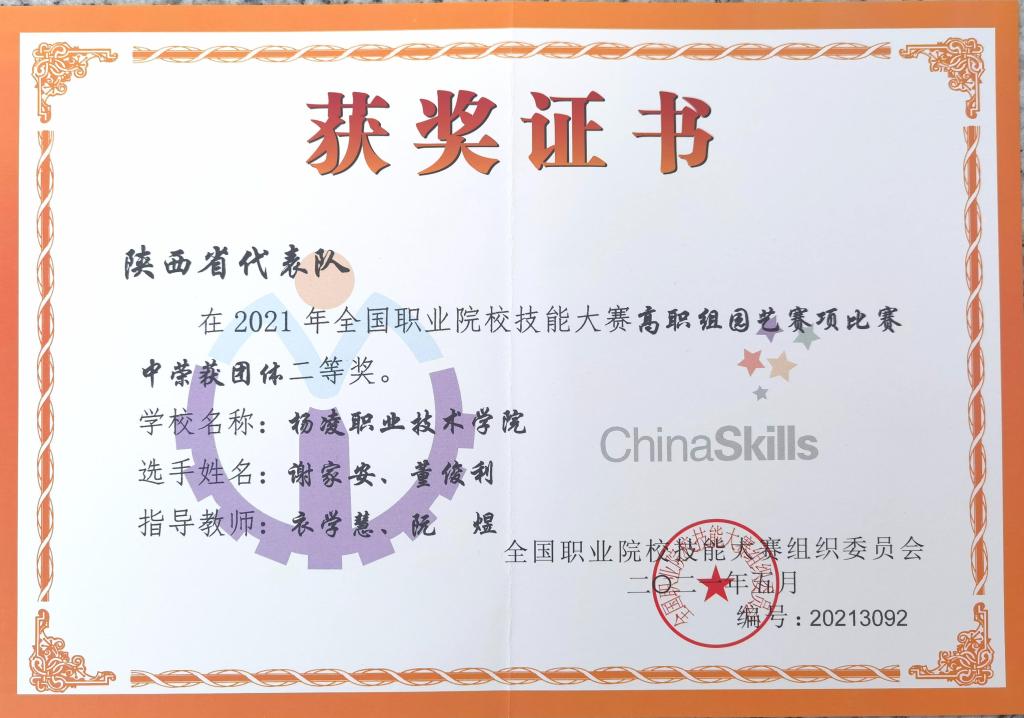 6月19至22日,2021年全国职业院校技能大赛(高职组)“园艺”赛项在潍坊职业技术学院举行。来自全国各省、市、自治区的28支代表队参赛。由我校学生董俊利、谢家安组成的陕西省代表队获二等奖。