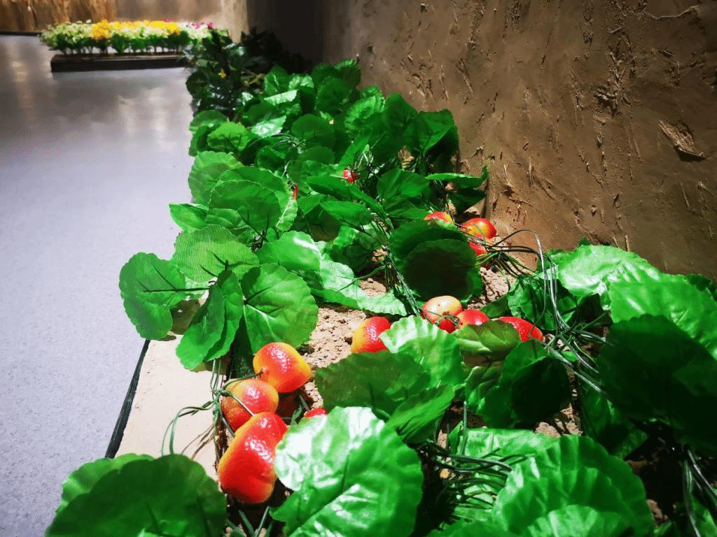 耕读体验展厅对隋代北方农家小院和古代学堂进行场景还原,其中农家小院展示的小麦、桃花、西瓜、草莓等实物均为我校科研成果。除此之外还有瓦罐、石碾、竹篮、水缸等古代农家生活用品,展现了真实的古代农家生活。