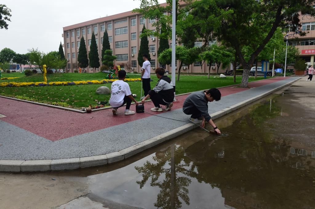 活动前期,自动化技术创新小组师生在雨后检查了南校区人行道积水情况,发现有几处人流量大的路面排水不畅,导致雨后路面仍大面积积水,影响师生通行,逐结合专业知识、现场路面特点等设计实施方案、采购元件材料、制作便携式排水泵对路面积水进行抽排,将路面积攒雨水喷洒到路边绿化带,为绿化带进行灌溉。自动化技术创新小组学生根据老师指导,进行水泵进水方式选择、供电方式选择,搭建抽水系统。在保证抽排路面积水的同时,还能保证用电安全、并方便移动到其他积水点进行抽排。