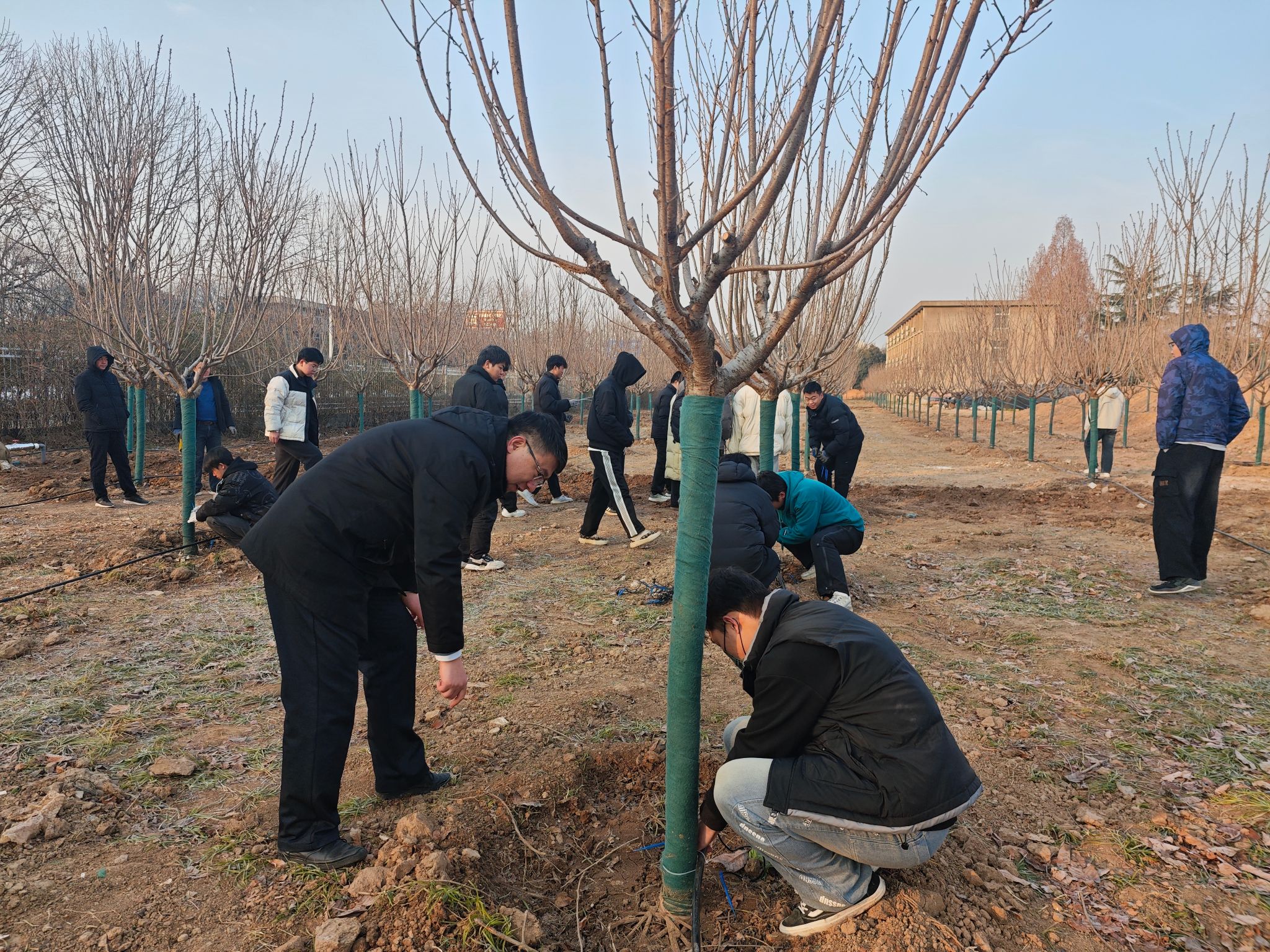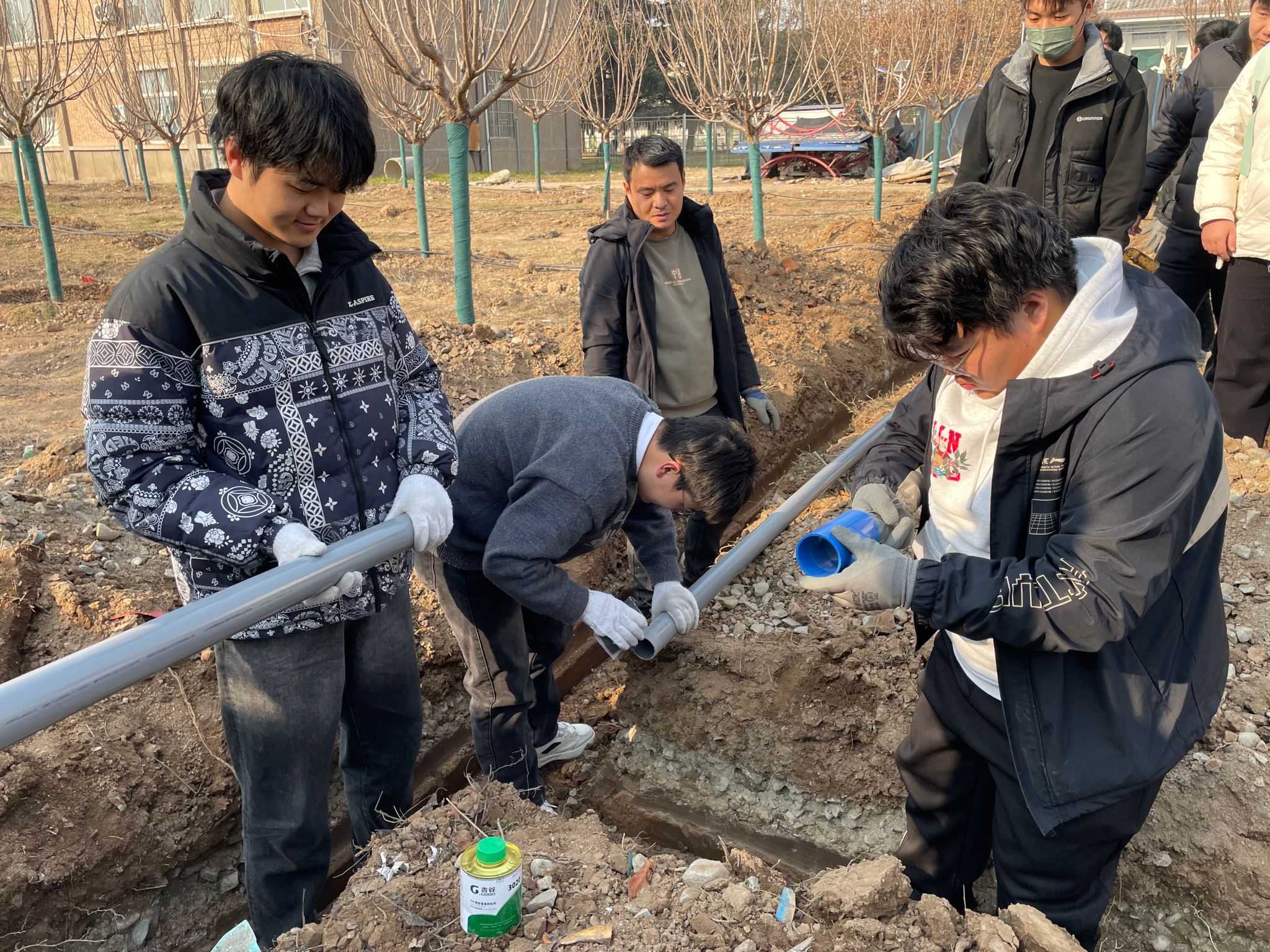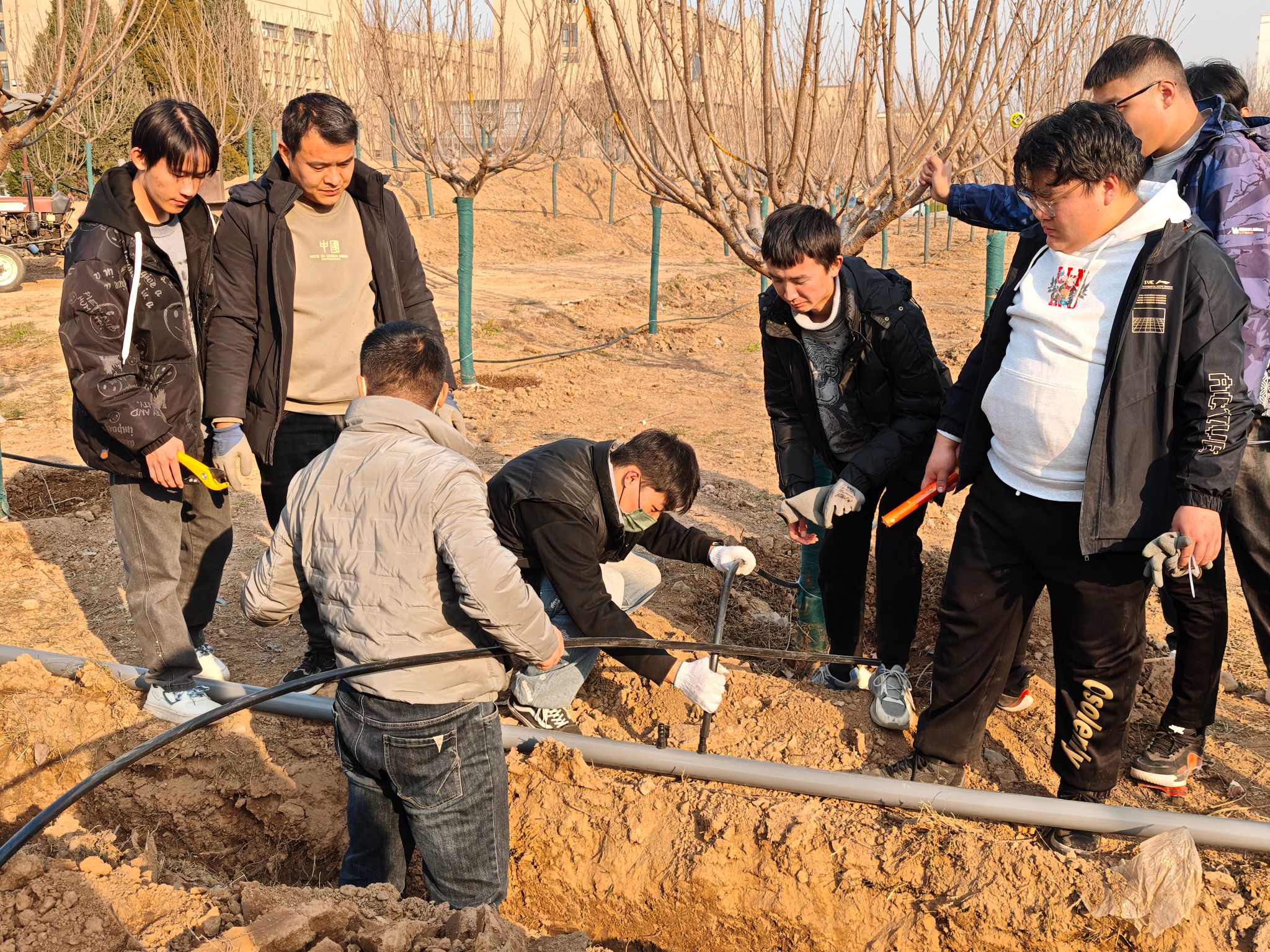 实训现场,企业派出经验丰富的技术进行施工交底学生了解设备性能行业前沿技术水利工程学院指导老师为学生们详细讲解项目类型特点、工作原理设备特征示范演示设备、管路安装技术要领和注意事项学生们热情高涨分组协作,从图纸解读到管件切割、组装,再到最后的密封检测,每一个环节都严谨对待。遇到难题时,指导老师和技术人员耐心解答,手把手指导操作技巧,现场学习氛围浓厚。最后通水测试,滴箭稳定出流,精准滋润樱花根系,完美展现滴灌系统的高效运行。
