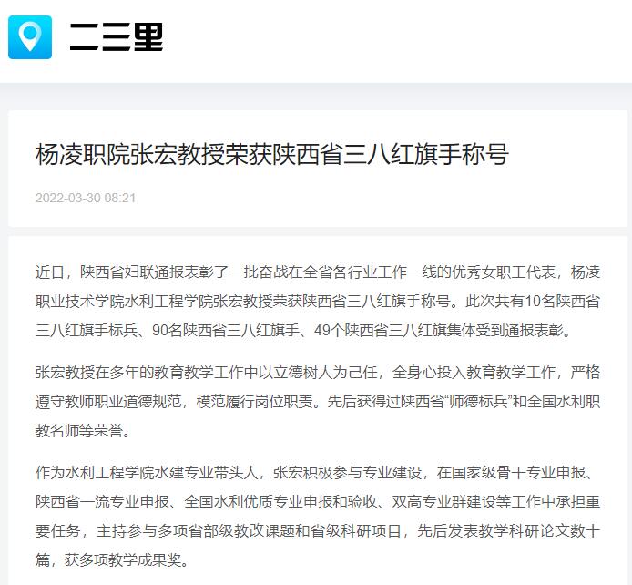 近日,陕西省妇联通报表彰了一批奋战在全省各行业工作一线的优秀女职工代表,杨凌职业技术学院水利工程学院张宏教授荣获陕西省三八红旗手称号。此次共有10名陕西省三八红旗手标兵、90名陕西省三八红旗手、49个陕西省三八红旗集体受到通报表彰。