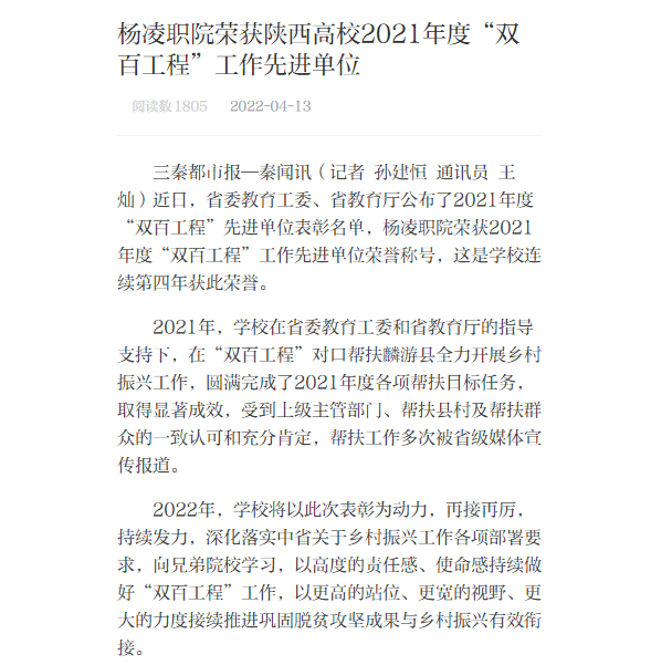 三秦都市报—秦闻讯(记者 孙建恒 通讯员 王灿)近日,省委教育工委、省教育厅公布了2021年度“双百工程”先进单位表彰名单,杨凌职院荣获2021年度“双百工程”工作先进单位荣誉称号,这是学校连续第四年获此荣誉。