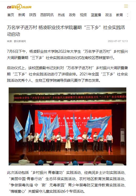 7月6日下午,杨凌职业技术学院2022年大学生“万名学子进万村”乡村振兴大调研暨暑期“三下乡”社会实践活动启动仪式在南校区思辨堂举行。