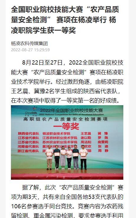 8月22日至27日,2022全国职业院校技能大赛“农产品质量安全检测”赛项在杨凌职业技术学院举行。经过激烈角逐,由杨凌职院王艺晨、冀豫2名学生组成的陕西省代表队,在本次赛项中取得了一等奖第一名的好成绩。