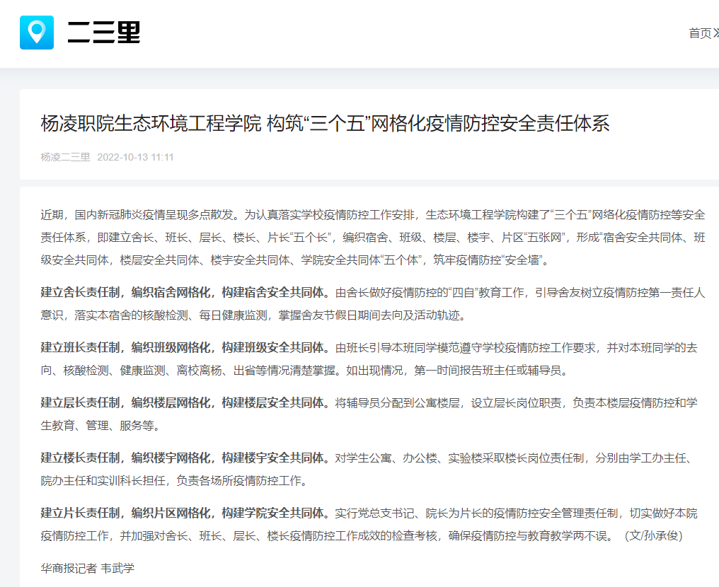 建立楼长责任制,编织楼宇网格化,构建楼宇安全共同体。对学生公寓、办公楼、实验楼采取楼长岗位责任制,分别由学工办主任、院办主任和实训科长担任,负责各场所疫情防控工作。