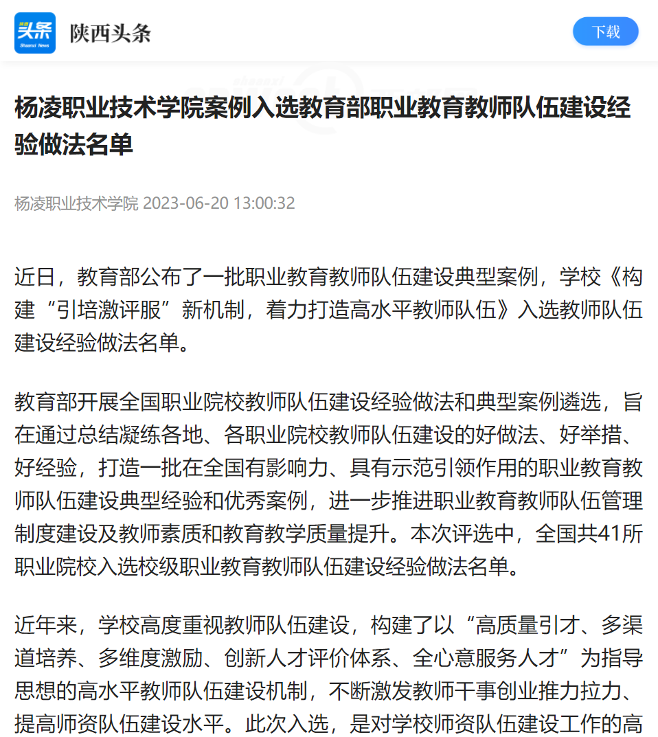【陕西头条】杨凌职业技术学院案例入选教育部职业教育教师队伍建设经验做法名单