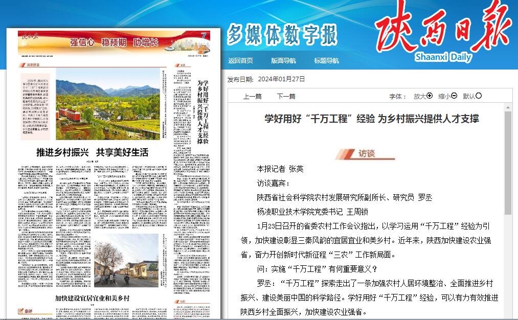 【陕西日报】专访杨凌职业技术学院党委书记王周锁:学好用好“千万工程”经验 为乡村振兴提供人才支撑