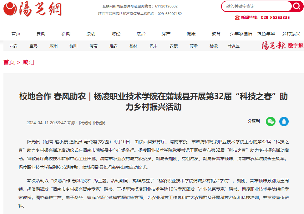【阳光网】校地合作 春风助农|杨凌职业技术学院在蒲城县开展第32届“科技之春”助力乡村振兴活动