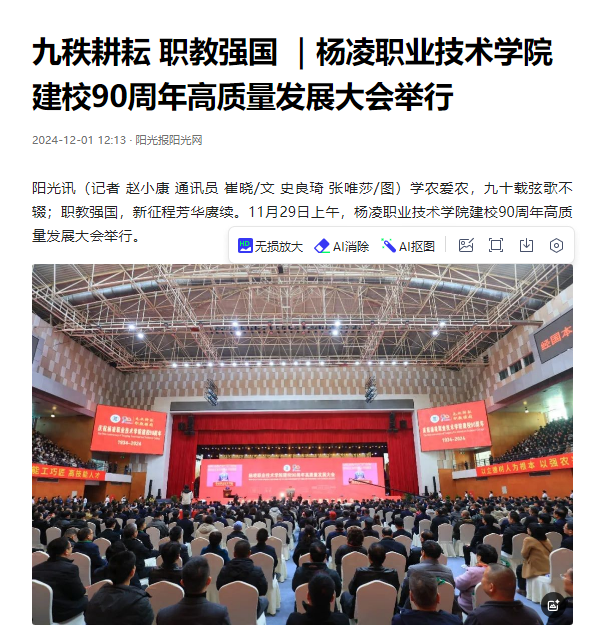 学农爱农,九十载弦歌不辍;职教强国,新征程芳华赓续。11月29日上午,杨凌职业技术学院建校90周年高质量发展大会举行。