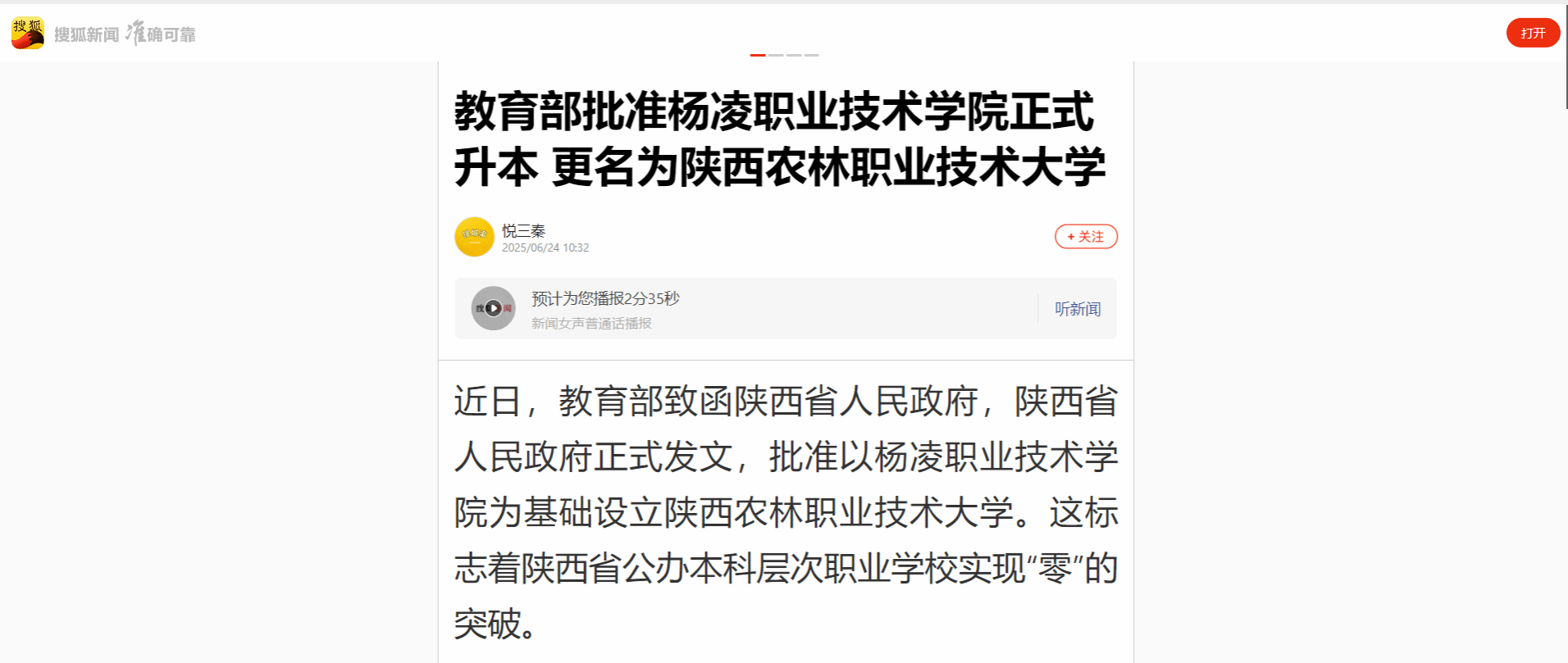 【搜狐】教育部批准杨凌职业技术学院正式升本 更名为陕西农林职业技术大学