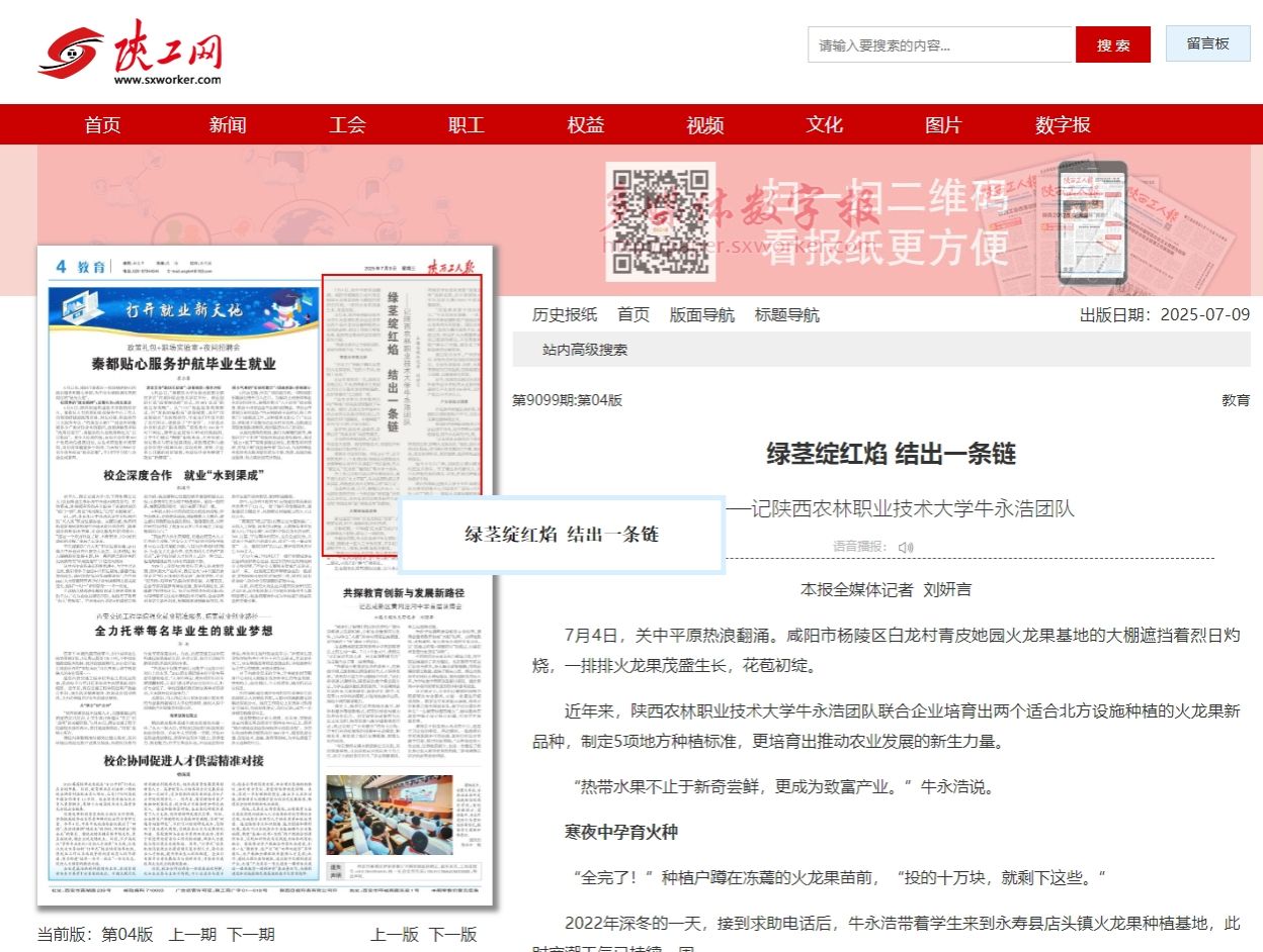 近年来,陕西农林职业技术大学牛永浩团队联合企业培育出两个适合北方设施种植的火龙果新品种,制定5项地方种植标准,更培育出推动农业发展的新生力量。