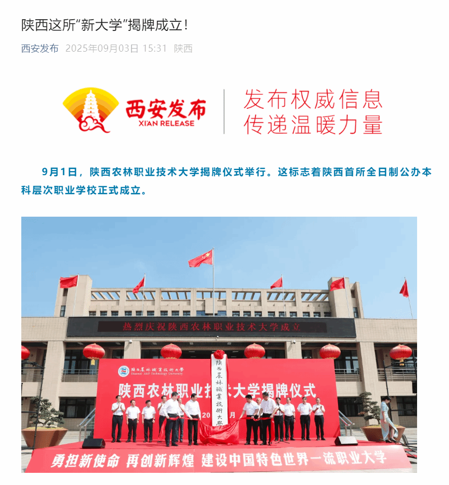 9月1日,陕西农林职业技术大学揭牌仪式举行。这标志着陕西首所全日制公办本科层次职业学校正式成立。