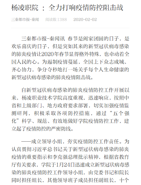 ——强化宣传教育,坚定战胜疫情信心。一是围绕新型冠状病毒感染的肺炎症状、危害和预防等重点内容,利用官方微信、微信群、QQ群等平台,积极发布疫情防控知识和方法,使全体师生员工理性认识和科学防控疫情。二是利用校园网站、官方微信、微信群、QQ群等平台,及时传达中省和上级部门有关要求,报道学院疫情防控工作情况和措施。三是在三校区校园内悬挂了100余条疫情防控宣传横幅,加强疫情防控知识宣传工作。四是切实加强学院教职工、部门负责人暨干部群、杨职校友交流群等微信群的管理,及时制止未经确认的疫情谣言,避免引起不必要的恐慌。