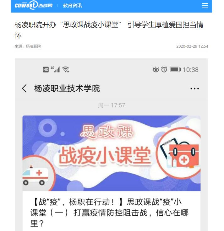 疫情防控是一场没有硝烟的战争,更是一场生动的“思政大课”。为了上好这堂课,学院马克思主义学院的教师们及时搜集整理疫情防控相关素材,围绕爱国主义、敬畏生命、社会责任、遵守规则、爱与感恩等,不断加强疫情防控期间的思想政治教育;党委宣传部深入挖掘在疫情防控一线的先进师生和典型事迹,并借助校园网站、学院官微和中省主流媒体做好宣传,不断凝聚和传播正能量,激励广大师生勇担时代重任,在各自岗位上为疫情防控作出应有贡献。(杨凌职院党委宣传部 供稿)
