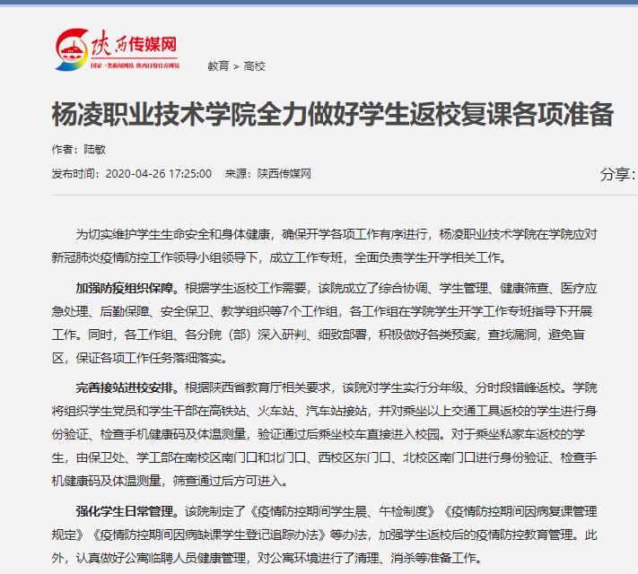 【陕西传媒网】杨凌职业技术学院全力做好学生返校复课各项准备