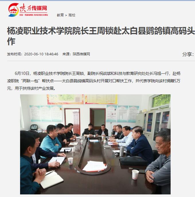 610日,杨凌职业技术学院院长王周锁、副院长祝战斌和科技与教育研究处处长冯旭一行,赴杨凌职院“两联一包”帮扶点——太白县鹦鸽镇高码头村开展对口帮扶工作,并代表学院向该村捐赠5万元,用于扶持该村产业发展。