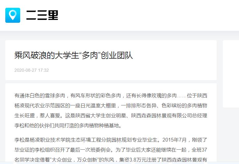 李松是杨凌职业技术学院生态环境工程分院园林规划专业毕业生。2015年7月,刚领了毕业证的李松组织召开了最后一次班委例会。为了毕业后大家还能继续在一起,全班37名同学决定借着“大众创业,万众创新”的东风,集资3.8万元注册了陕西垚森园林景观有限公司,主要开展绿化养护、园林景观设计与施工、园林信息咨询、花卉盆景租赁、农副产品种植和销售等业务。这群平均年龄只有20岁的大学生,凭着一腔热血,义无反顾地踏上了创业之路。