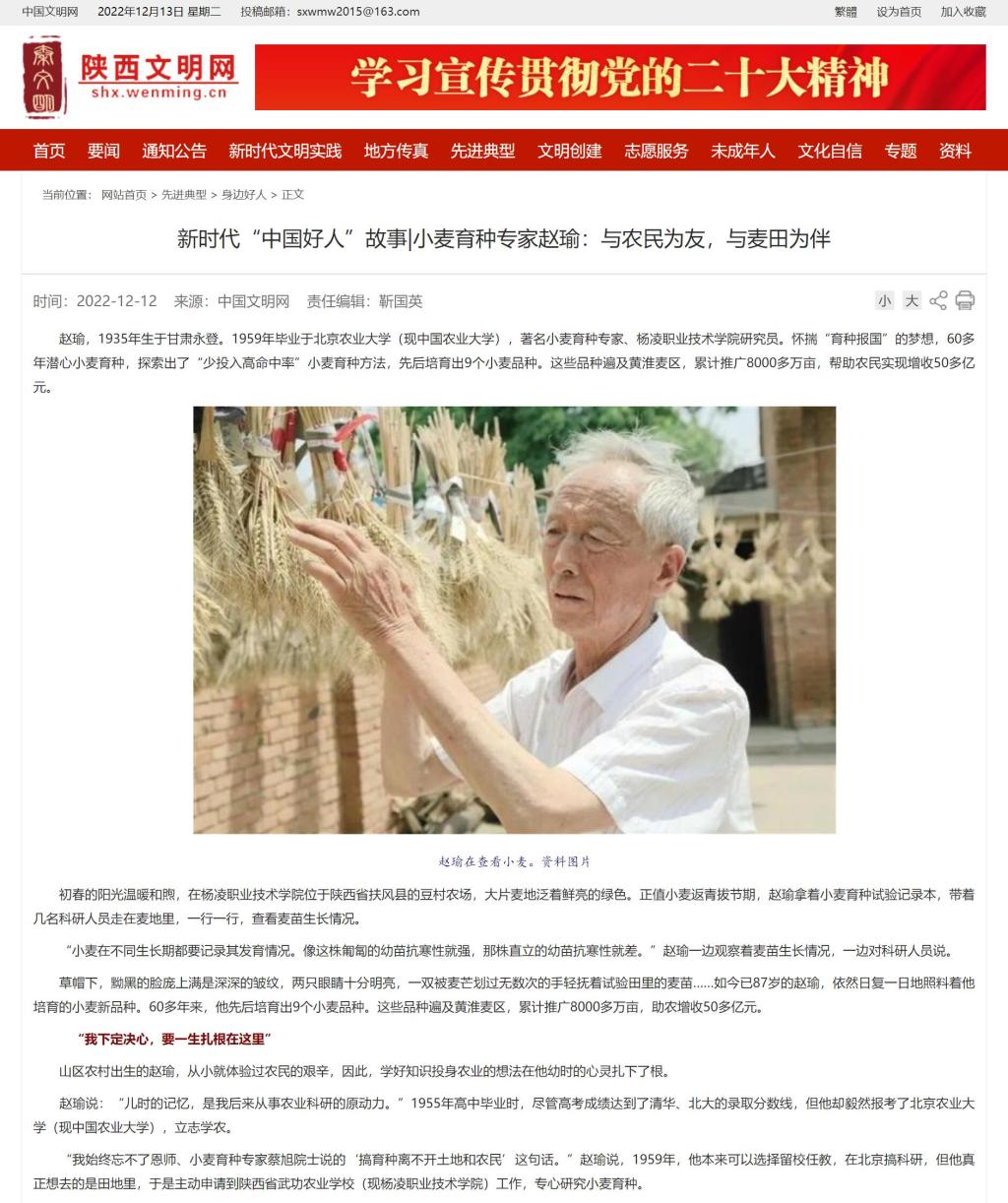 【陕西文明网】新时代“中国好人”故事|小麦育种专家赵瑜:与农民为友,与麦田为伴