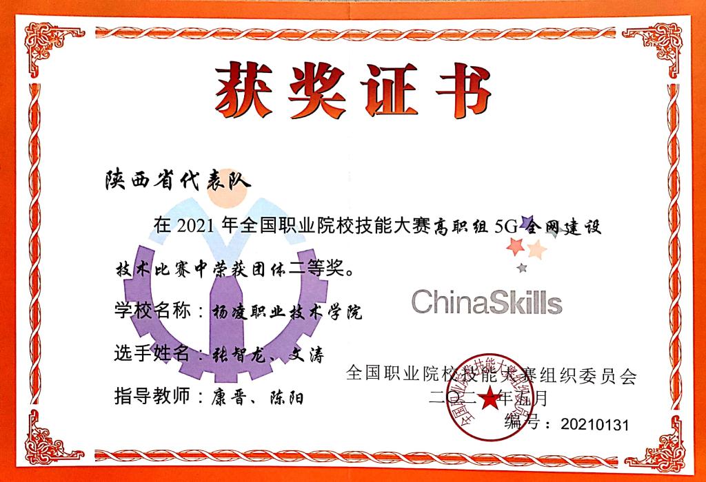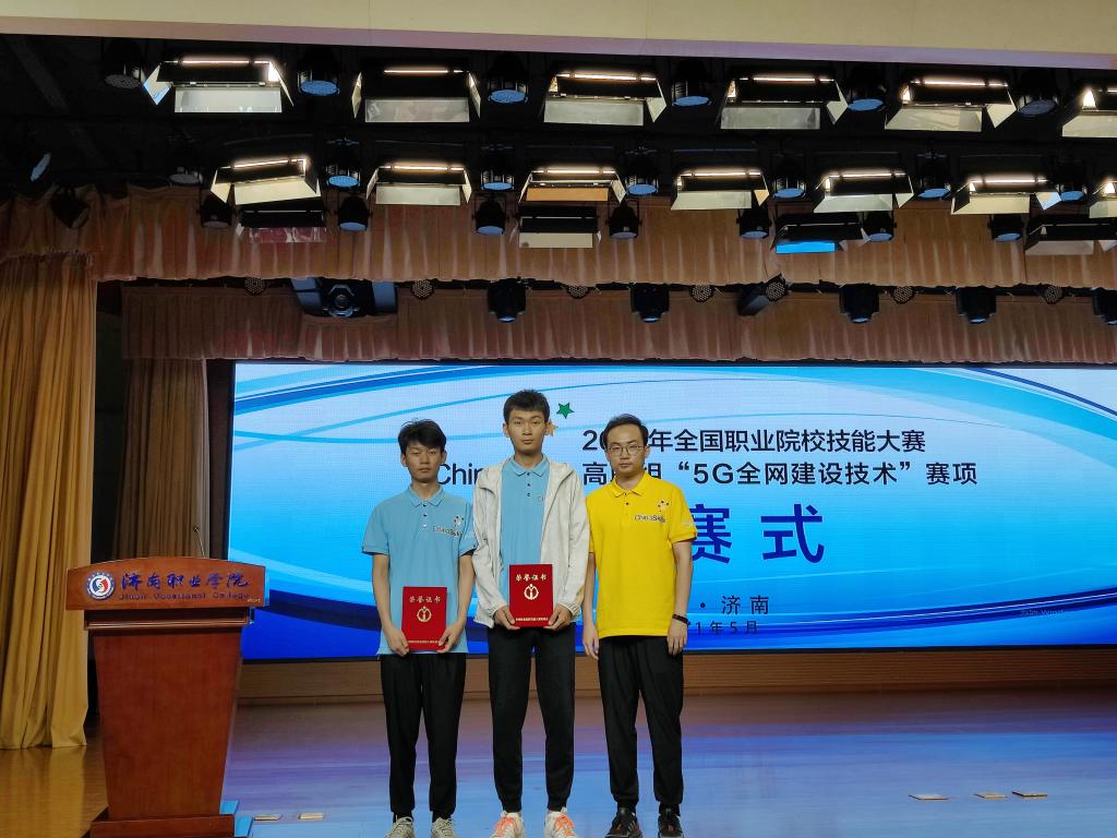 2021年5月20日-21日,全国职业院校技能大赛高职组“5G全网建设技术”赛项由山东济南职业学院承办,在济南国际会展中心举行,由我校信息工程学院通信技术专业张智龙、文涛两名同学组成的陕西代表队经过2天共8小时的激烈角逐,最终荣获二等奖。
